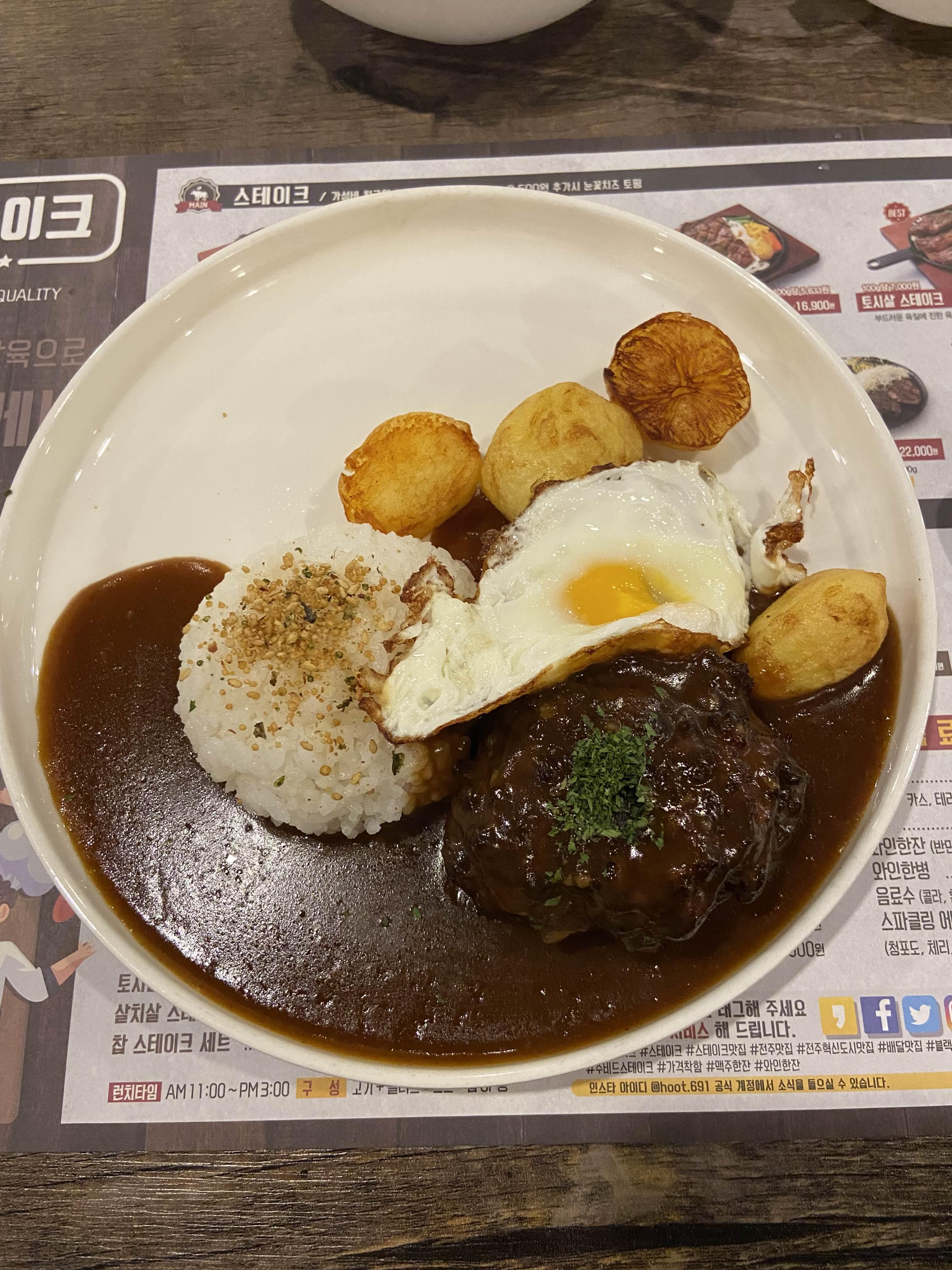 점심시간이라 사람이 많고 주문도 밀렸었는데요 생각보단 음식이 빨리 나왔어요. 함박스테이크가 생각했던 엄청 곱게 갈은 고기로 된 함박스테이크는 아니였구요 씹는맛이 있었습니다. 저는 개인적으로 통감자가 너무 맛있었습니다ㅎ 겉바속촉으로 너무 맛있게 구어졌더라구요~!