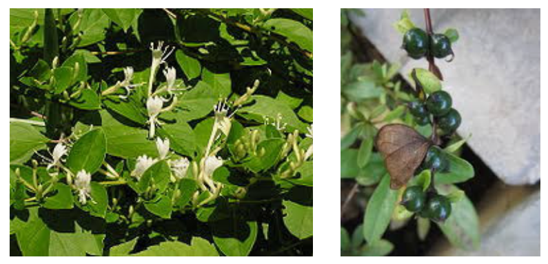 인동덩굴의 열매는 둥글고 검은색이며, 9~10월에 성숙한다.