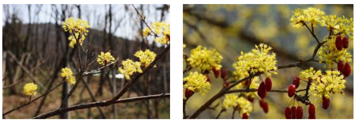 꽃은 잎이 나오기 전 3월경에 노랑색으로 개화하는데 산형화서로 20~30개의 작은 꽃이 맺혀있다.