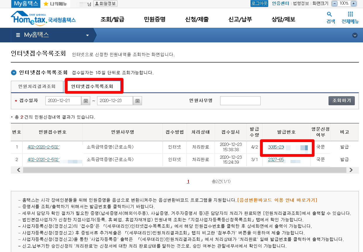 그리고 민원결과조회 옆에 인터넷접수목록조회를 보시면 제가 접수한 민원접수번호와 민원 사무명이 뜹니다. 그리고 우측에 발급번호가 뜨게 되는데요, 이 발급번호를 누르게 되면 증명서의 미리보기 화면이 뜨게 됩니다.