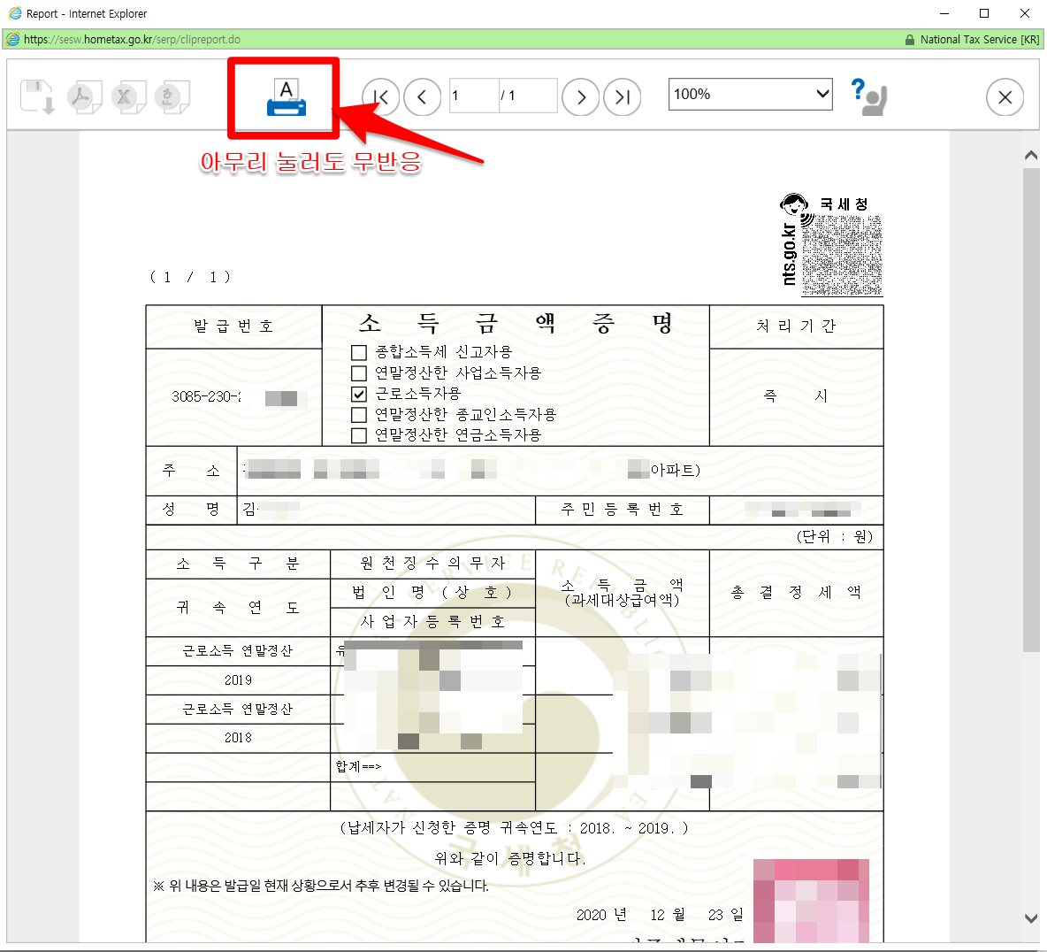 몇일전 대출관련 제출 서류로 인해 홈택스에서 소득금액증명서를 프린트 해야할 일이 생겼습니다. 그런데 프린트 화면에서 프린터 아이콘을 눌러도 반응이 없고 인쇄하기 창이 뜨지 않는것입니다.