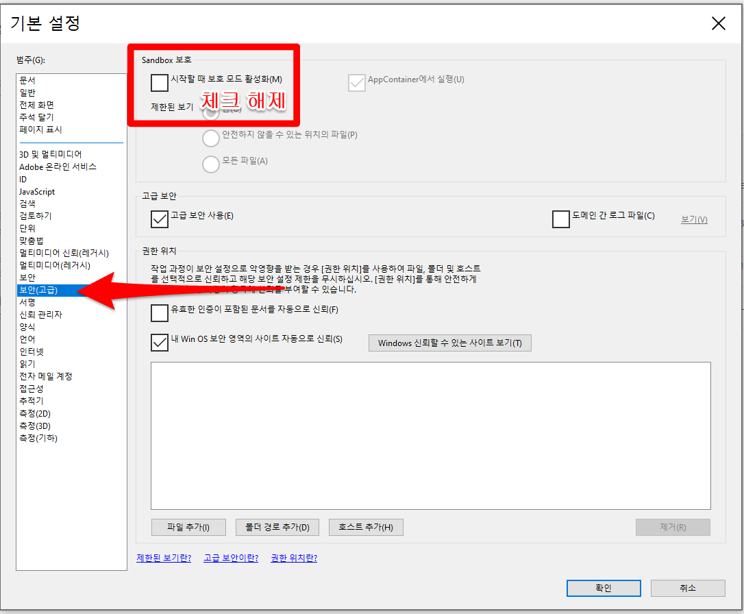 4) 상단에 시작할 때 보호 모드 활성화 체크 되어 있는 부분을 체크를 해제한다.