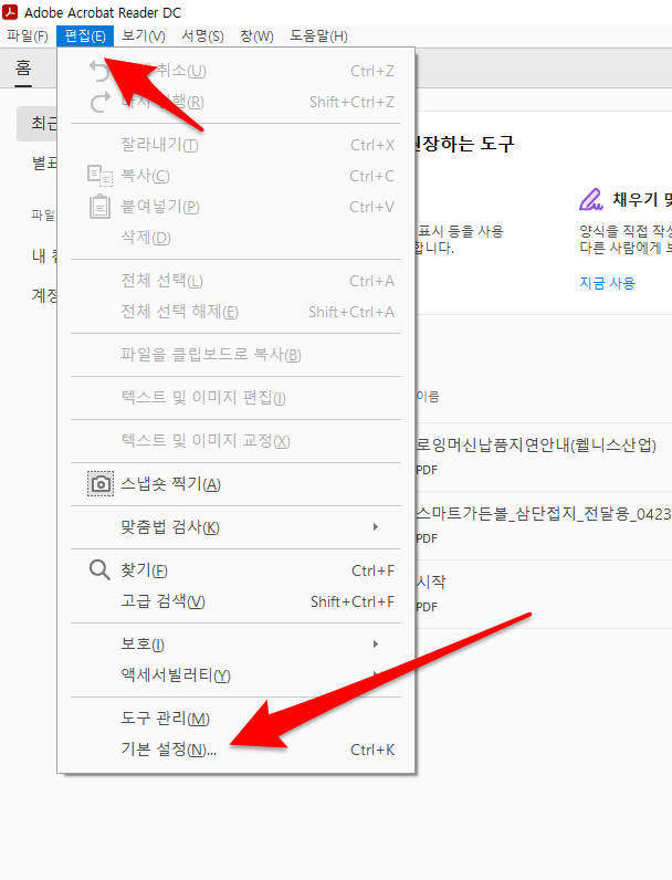 2) 어크로뱃리더 프로그램을 열고 상단메뉴중 편집에 들어가서 기본설정 을 클릭한다.